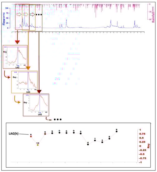 Cross-correlation analyses (CCA) are widely used in signal processing. These analyses can be used to characterize the temporal structure of a hydrological signal [,,,,]. Some authors have used CCA to determine the relationships between several variables, such as rainfall, flow rates, electrical conductivity, turbidity, or water temperature [,,,,].