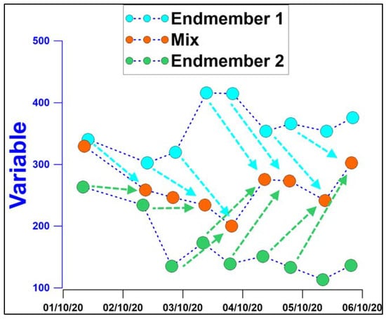 The water volume in a mix (Vf) of two end members (V1 and V2) in a stationary mass transfer is the sum of all end members (Vf = V1 + V2). If two non-covariant variables of concentration A and B are present in each end member, the mixing equations are as follows (Equation (1)):