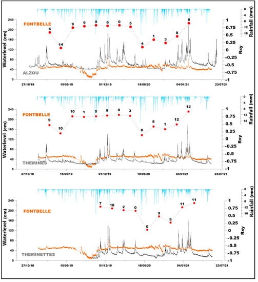 Figure 4 compares the water levels at the Fontbelle spring (in orange), and respectively at Alzou, Thémines, and Théminettes sinks (in gray). The rainfall is represented in blue. The water level of each sink is correlated to the water level of the springs and the Ouysse river at the Calès bridge, with respective delays. The time lag and the correlation value are calculated for the whole data set but also for each sliding window. Full graphical results for each station are shown in Appendix A.