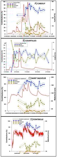 For Fontbelle (Figure 5D), water from the Alzou sink does not appear to contribute to its chemistry in any of the samples. The model results are consistent with the results of the tracer test done at the Alzou which showed negligible restitution at Fontbelle. The influence of the flood is much lower than at the other springs, but there is a slight increase in the contributions of the karst during the peak of the flood, from 80 to 90%. The remaining contributions are attributed to the Limargue sinks (between 10 and 20%). As for Cabouy, there is a slight increase in the contributions of the Limargue at the beginning of the first flood peak, probably related to the fact that the flood follows a prolonged low water period.
