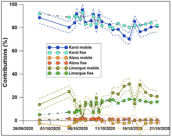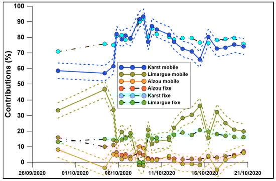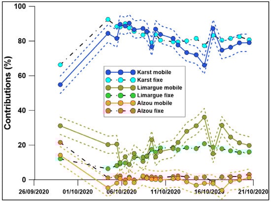During the flood, the fixed sample contributions are well included in the 5% error range of the mobile model and no significant changes are observed at any outlet for any end member. After 12 October, discrepancies are observed again. These differences concentrate on the Limargue and Alzou contributions with wider variations for the mobile origin model compared to the fixed origin model, which shows a more linear evolution for Limargue and Alzou contributions at all springs.