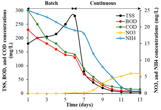The MBBR system was fed with sewage from the Karbala wastewater treatment plant (WWTP) and the start-up process was evaluated after 13 days. Figure 4 shows the start-up performance of the MBBR system at batch and continuous feed modes. The first 7 days illustrated the concentration of the pollutant inside the MBBR system that was fed at batch mode, while from day 7 to day 13 this was operated in continuous mode. In addition, further data beyond 13 days for both scenarios are listed in Table S1 in the Supplementary Materials. A duration of 13 days was found sufficient to achieve rapid steady state condition due to the MBBR system’s advantage and biofilm formation. This can be observed by low pollutants concentration in the effluent. Figure 4 indicated that TSS concentrations (biomass) increased in the system during batch mode due to an increase in the suspended growth over the attached growth at the beginning of the process because the biofilm layer needs a period for the formation [11]. However, the TSS concentration gradually decreased during the continuous fed mode to about 5 mg/L at the steady state because of the formation of the biofilm layer on the carriers.