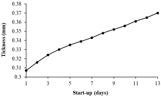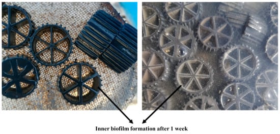 Biofilm formation is one of the most critical characteristics of attached growth in the MBBR system. Figure 5 displays the biofilm development during the start-up process, where an increase in the biofilm thickness is observed with start-up time. Within 13 days, the thickness increased from 0 to 0.37 mm on the inner surface of the carriers, as shown in Figure 6. In this study, the biofilm formation was 0.197 g VS/g biofilm after 13 days of the start-up. Likewise, Liu et al. [3] reported that the average biomass attachment reached 0.533 g VS/g biofilm after 30 days. The effectiveness of biofilm formation was also supported by the reduction of suspended growth microorganisms (TSS) in the system and high nitrate generation as a result of ammonium oxidation. The biomass carrier produced fluid separation and intercepted suspended matter for biofilm formation, contributing to the energy-uncoupling metabolism in the process. Biofilm formation also increases the SRT of sludge in the system, which promotes endogenous respiration within the biofilm layers that may eliminate sludge generation [3]. At the beginning of the formation of the biofilm layer, the oxidation of ammonia contributed to reducing the pH from 7 to 6, but increasing the thickness of the biofilm layer and the denitrification process inside the biofilm layers contributed to raising the pH ratio to the normal level. In addition, the system was filled with 40% bio-carriers, which was found sufficient for the best MBBR performance, as supported by Faris et al. [10], who reported that the best results can be achieved when the MBBR system is filled with 40–50% bio-carriers.