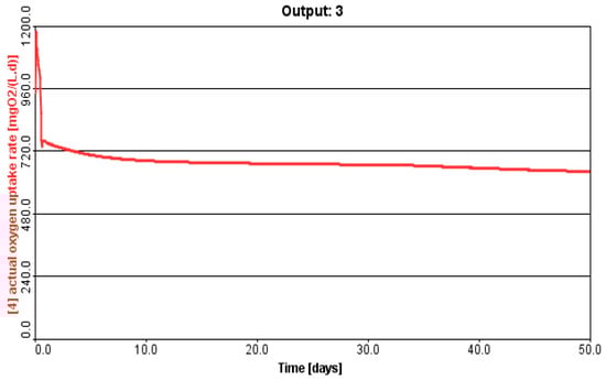 The MBBR process can be modified to the IFAS process by returning the activated sludge from the settling tank to the aeration basin. The IFAS system combines the processes of attached and suspended growth bacteria [10]. In Scenario 2, the process was operated with no WAS from the system and increased HRT from 6 to 20 h, SRT from 15 to 50 days and RAS from 50 to 150%. Notably, Scenario 2 successfully eliminated sludge production from the system. The operational results are shown in Table 3 and the O2 uptake rate data in the bio-treatment unit for scenario 2 is shown in Figure 8. Returning the sludge increases digestion in the aeration tank due to endogenous respiration, thus reducing sludge production [21]. Similarly, Faris et al. [10] reported that sludge is reduced by more than 60% when the system is operated with 200% of RAS, which indicates that RAS positively impacted sludge reduction in the MBBR system. Sludge return causes a change in the mass balance of sludge amount, leading to sludge digestion within the system. Likewise, Salehiziri et al. [8] have also reported that long SRT could reduce sludge production. On the contrary, most of the settled sludge in the IFAS process is believed to be chemical sludge due to the reaction of calcium hydroxide with phosphate [10].