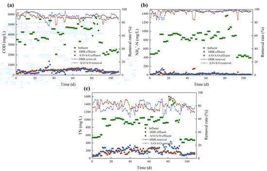 Concentration and removal rate of COD (a), NH-N (b) and TN (c) in the DBR and the A/O/A/O systems.