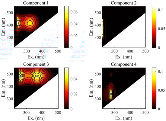 The fluorescence excitation–emission matrix combined parallel factor (EEM-PARAFAC) analysis method can efficiently and accurately measure the DOM composition and relative content in water samples and has been widely used in marine, river, and engineering water bodies [15,16]. EEM-PARAFC analysis can be used to decompose the fluorescence spectrum into independent fluorescence components [17]. Figure 3 shows the four DOM components of piggery wastewater. Component 1 had two fluorescence peaks at Ex/Em 240/410 nm and 320/410 nm and was identified as a fulvic-like and humic-like substance (C1) [16]. Component 2 had a fluorescence peak at Ex/Em 225/340 nm. A component with a fluorescence peak at Ex = 235∼240 nm/Em = 340∼355 nm in the PARAFAC analysis was identified as a tyrosine-like substance (C2) [18]. Component 3 had two fluorescence peaks at Ex/Em 260/485 nm and 365/485 nm and was considered to be a humic-like substance (C3) [17]. There was a fluorescence peak at Ex/Em 280/340 nm of component 4, which could be considered a tryptophan-like substance (C4) [19].