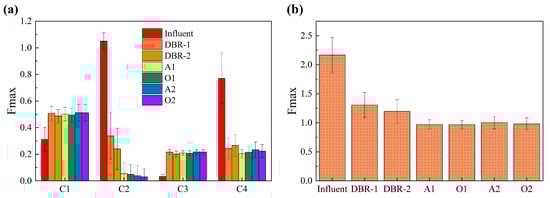 Average maximum fluorescence intensity (Fmax) of (a) each organic component and (b) all four organic components in different reactors of 25 samples.