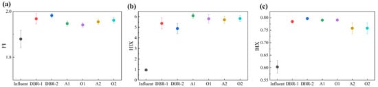 Figure 5 shows the variation diagram of fluorescence spectral indexes that can reflect the chemical characteristics of DOM in piggery wastewater [20]. The fluorescence index (FI), humus index (HIX), and biological index (BIX) were used as supplementary evaluation indexes. As shown in Figure 5a, the average FI of the influent was 1.88. The average FI of the DBR and A/O/A/O systems was higher than 1.9. This phenomenon indicates that the endogenous characteristics of discharge water increased after biological treatment. Microbial endogenous metabolites are the metabolites of activated sludge flora, and they are difficult for microorganisms to degrade [21]. The average value of the effluent FI of each reaction tank in the DBR system was slightly higher than that in the A/O/A/O system, indicating that the DBR system had stronger endogenous characteristics. HIX can reflect the degree of humification of DOM. As shown in Figure 5b, the average HIX of the influent was about one. The effluent HIX of each reaction tank of the DBR system was around five, and that of the A/O/A/O system was between five and six. Thus, the humification characteristics of piggery wastewater after biological treatment were enhanced, and the enhancement performance of the A/O/A/O system was greater than that of the DBR system. BIX represents the biological activity of DOM in water. As shown in Figure 5c, the influent BIX was about 0.6, the BIX of the DBR system was nearly 0.8, the BIX of the A1 and O1 tanks was about 0.8, and the BIX of A2 and O2 tanks was about 0.75. This phenomenon indicates that the influent bioactivity was very weak, and a new soluble organic matter was produced after biological treatment [22].