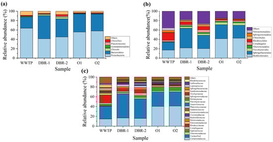 As shown in Figure 6a, at the phylum level, the abundances of Proteobacteria and Bacteroidetes in the WWTP system were 64% and 23%, respectively, accounting for a total of 87% abundance. They were the main dominant bacteria phyla in the biological treatment system of urban sewage [23,24]. In DBR-1 and DBR-2, the abundances of Proteobacteria were 41% and 45%, respectively, and that of Bacteroidetes reached 49% and 39%, respectively. Compared with the WWTP system, Proteobacteria was significantly reduced, while the opposite was true for Bacteroidetes. Bacteroidetes adapted to the piggery wastewater containing a high concentration of pollutants. In O1 and O2, the total abundances of Proteobacteria and Bacteroidetes reached 94.4% and 94%, respectively, which was higher than that of WWTP and DBR systems. In addition, Proteobacteria and Bacteroides are responsible for the stable removal of NH-N from piggery wastewater [25,26], which also explains why the A/O/A/O system had better NH-N removal performance.