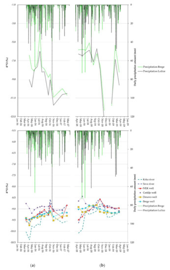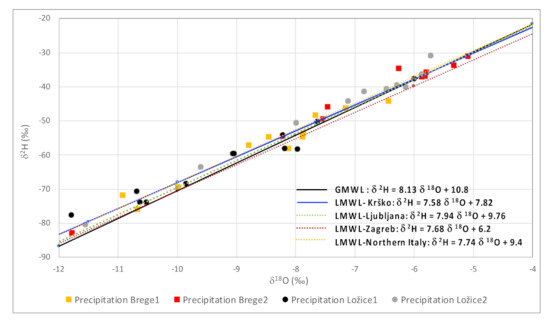 - Parlov, J.; Kovač, Z.; Nakić, Z.; Barešić, J. Using Water Stable Isotopes for Identifying Groundwater Recharge Sources of the Unconfined Alluvial Zagreb Aquifer (Croatia). Water 2019, 11, 2177. [Google Scholar] [CrossRef]