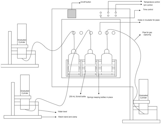 An Orbital shaker-incubator ES-20/60 was used as the main vessel for the DDS experiments. The incubator had enough space for six 250 mL Schott bottles. An 8 mm hole was drilled into each bottle’s lid in order to allow for gas capturing with a tube. The gas was captured with six 500 mL graduated cylinders that were inverted and submerged in water; the gas production rate could then be correlated with the water displaced in the cylinders over the course of the experiment. A schematic of this apparatus is shown in Figure 1.