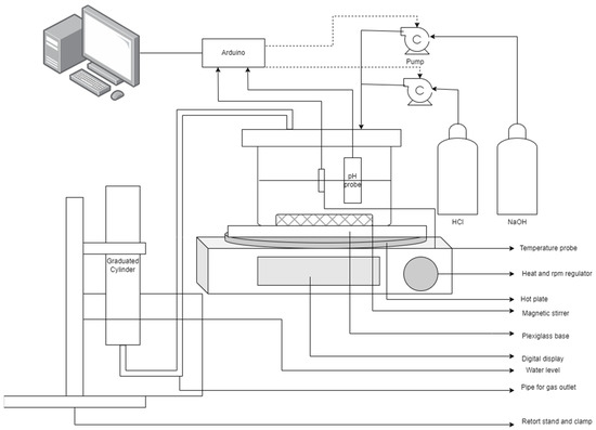 The initial mass of each feed was measured by a Radwag PS 8000/X digital lab scale. The pH was measured using a Haoshi H101 pH electrode. The temperature inside the reactors was measured by a Maxim DS18B20 temperature sensor. The pH was controlled by using a precision peristaltic pump and an intelligent stepper controller. The pump, stepper controller, pH, and temperature sensors were all coupled to an Arduino MEGA 2560.