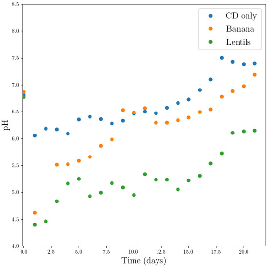 Figure 3 depicts a sharp initial decrease in the pH on the first day, then a steep incline in the pH on the second day, and then a steady increase in the pH until a plateau is reached in all the different feedstocks at around day 18. There is a noticeable difference in the pH of the lentil feedstock compared to the cow dung only and banana feedstocks. This could be attributed to the fact that the feed is protein-rich, and as such it was expected to produce far more ammonium than the other two feedstocks [10,30]. The production of ammonium typically correlates with the first two steps of the anaerobic digestion process (hydrolysis and acidogenesis), and these first two steps generally occur at lower pH values than the rest of the process [31,32,33], which explains why the pH of the lentil feedstock was notably lower than that of the other two feedstocks.