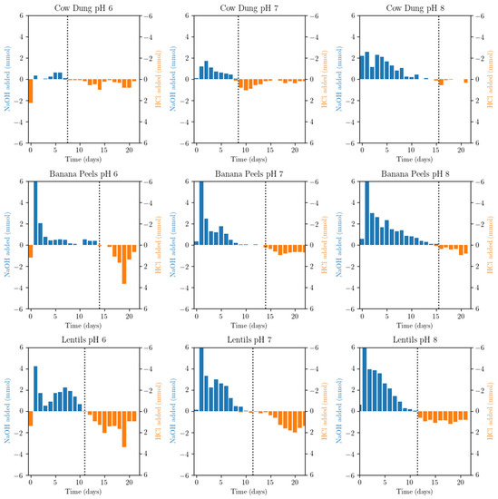 The lentil substrate was also the only substrate that was cooked before being placed in the reactors. This may be considered as a thermal pre-treatment step in the process. Thermal pre-treatment is a universally accepted method of augmenting the anaerobic digestion process because it accelerates the degradation of the substrate, which provides an easily digestible fraction of the substrate [34,35,36,37]. Another major difference between the three substrates is the fact that lentils contain much less lignocellulosic material compared to the other two substrates. Lignocellulosic biomass, especially the lignin content, has been reported as having an inhibitory effect on the anaerobic digestion process due to the complexity of the biomass structure [38,39,40,41]. Lentils typically contain 1.2 to 1.8% of lignin, whereas cow dung and banana peels range from 8–14% and 8–15%, respectively [42,43,44,45,46,47]. Figure 4 shows the acid/base dosing of each feed at the different pH set points.
