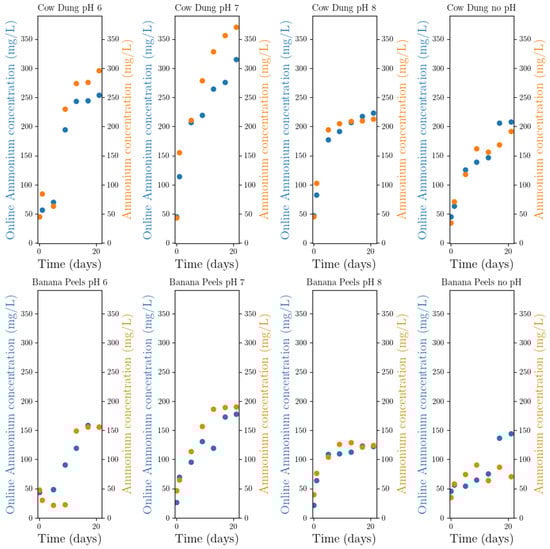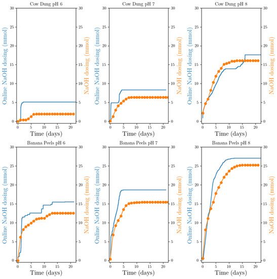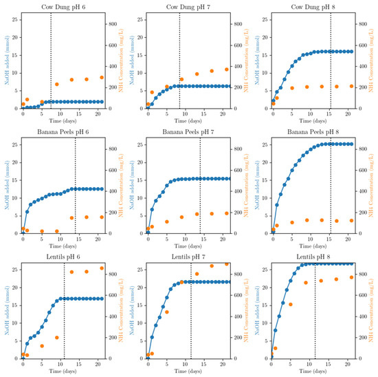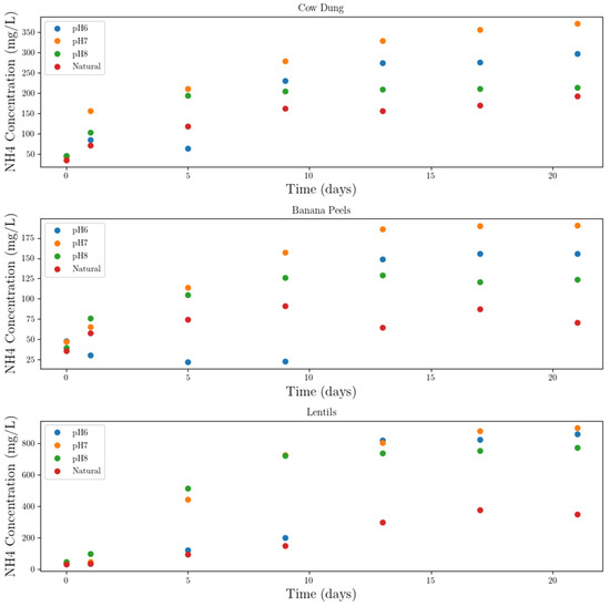 From Figure 4, it can be seen that the runs at a higher pH set point require more sodium hydroxide to reach the set point, however, the time taken to reach the switch point (when hydrochloric acid must be added instead of sodium hydroxide to maintain the set point) does not vary significantly with each feed. The switch point indicates a change in regime for the process. It is noted from Figure 4 that at a pH of 8, the cow dung and banana peel feeds take much longer to reach their switchover point. This could be attributed to the fact that the anaerobic digestion process is sub-optimal at such a relatively high pH. Typically, the process of anaerobic digestion prefers pH values between 6.8 and 7.2 [48,49,50]. These two substrates had almost identical switch points for the experiments performed at pH values of 6 and 7. However, the cow dung substrate had a faster switch point compared to the banana peel substrate at these pH values. Figure 4 also illustrates how the lentil substrate showed little variation in the switch point characteristics compared to other two substrates. Figure 5 shows the ammonium concentrations of each feed at different pH set points.