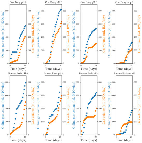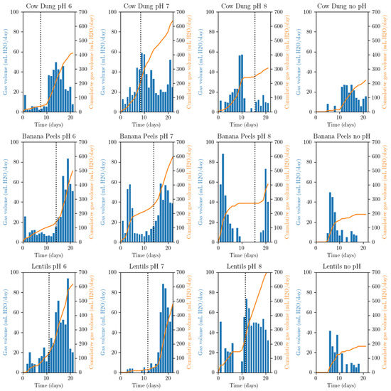 Gas volumes produced by each feed at different pH set points for the DDS. The orange line represents the cumulative water displaced over time, whereas the blue represents daily water displacement.