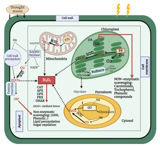 Drought causes the overproduction and accumulation of ROS in plant cells such as superoxide radicals (O2−), hydrogen peroxide (H2O2), singlet oxygen (O2), and hydroxyl radicals (OH). ROS are produced by several cellular compartments including chloroplasts, mitochondria, and peroxisomes. Chloroplasts are a potentially important source because excitatory pigments in thylakoid membranes can mix with O2 to form strong oxidants. ROS generation in peroxisomes is primarily due to increased photorespiration, which leads to H2O2 generation by glycolate oxidase [,]. In general, the increase in ROS production is proportional to the severity of drought [,]. It is associated with a variety of physiological and biochemical disorders resulting in oxidative damage to lipids, proteins, and other cellular macromolecules, including DNA and RNA, and can eventually lead to cell death [].