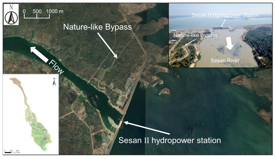 The Mekong River is the longest river in Southeast Asia, which is shared by six countries and serves nearly 70 million people. In recent decades, considerable attention has been paid to its abundant hydropower resources [46]. The hydro-ecological system consisting of the Mekong River and its tributaries provides many floodplain habitats with rich biodiversity and high productivity of fish and other aquatic organisms [47]. The Sesan, Sekong, and Srepok Rivers, three important tributaries of the Lower Mekong River, support nearly half of the fish species of the Lower Mekong River and have become a hotpot for hydropower development [48]. The Sesan Ⅱ Hydropower Station located on the mainstream of the Sesan River is the largest water conservancy project in Cambodia. Notably, a rock ramp bypass (13°33′34″ N; 106°15′03″ E) installed on the right side of the main dam is used to mitigate the impact of the dam on migratory fish. We use the terms “nature-like fishway” and “nature-like bypass” interchangeably, with both referring to the Sesan Ⅱ fishway.
