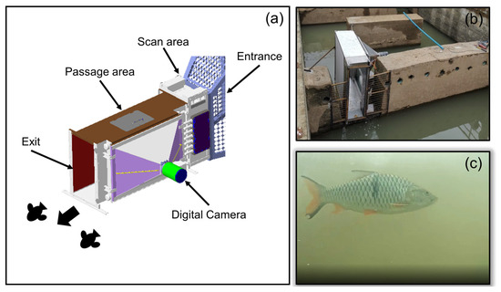 Underwater video monitoring systems have been widely used in fishway monitoring, especially for fish behavior studies [53]. A video monitoring system using two high-resolution digital cameras (Axis P1354, 30 FPS, 1280 × 1024 pixels, each with a coverage area of 0.7 m2) was installed at the fishway exit to observe the migration behavior of fish. When fish entered the scan area (with a length of 30 cm, a width of 20 cm, and a height of 110 cm), an infrared detection system, which was assisted by a lighting supplementation (only activated during the nighttime) to meet the observation requirement of distinguishing the fish outline under a nonluminous condition, was activated before the two cameras started to shoot. (Figure 3a,b). To eliminate useless videos as much as possible, both cameras were activated to film when any motion was detected by the infrared detection system (Figure 3c). If the fish passed back after a successful passage (always referred to “fallback” [32]), the video data were selected and it was decided whether they could be adopted, depending on the final locations of the fish (beyond or below the exit of NLP). Based on the filtered video data, the species of fish, fish size (total length and width), migrating direction, mean swimming velocity, and record time were identified and analyzed.