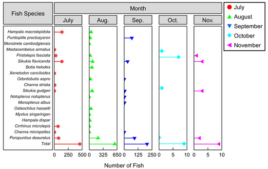 We mainly recorded the passing number of these 24 species that were identified in the traps between the two experiments (Table 2). Except for 5 unrecognized species across all the periods, including Channa gachua, Botia modesta, Hemisilurus mekongensis, Clarias fuscus, and Macrognathus siamensis, the number of fish from 19 species that successfully passed from July to November are shown in Figure 5.