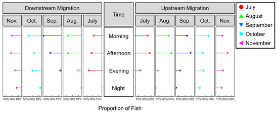 We classified 24 h of a day into four six-hour sections: morning (6:00–12:00), afternoon (12: 00–18: 00), evening (18:00–24: 00), and night (0: 00–6:00). As is shown in Figure 6, based on the video data across the four six-hour sections from July to November, the upstream and downstream migration of fish in the NLP frequently appeared during the morning and afternoon (collectively daytime), rather than the evening and night (collectively nighttime). For upstream migration, the proportion of migration during the daytime was largest (92.43%) in August and smallest (58.87%) in November, whereas for downstream migration, those during the daytime had the largest (95.13%) proportion in September and smallest (58.78%) in July. Notably, fish hardly moved at night, with the proportions even down to zero in July and September.