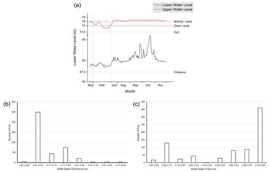 (a) Upper and lower water levels during the entire monitoring period. Relationship between the water depth of (b) entrance and (c) exit and the number of ascending fish. May* implies the periods of sampling (24 May to 28 May) and July* implies an incomplete monitoring period (17 July to 31 July). “Void” implies no sampling or monitoring data during this period.