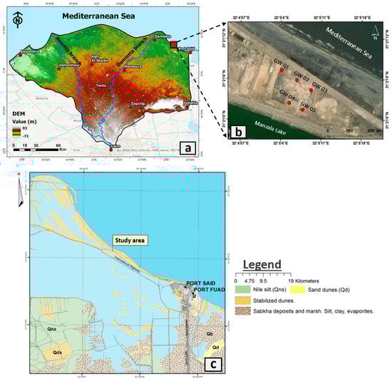 (a) The topography of Nile Delta, Egypt. (b) The study area with five test wells. (c) Geomorphologic units along the study area [].