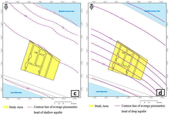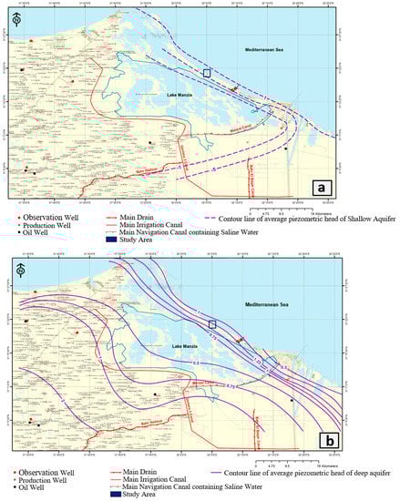 The North Delta aquifer (NDA) is a substantial groundwater aquifer and semi-confined groundwater system []. This geological layer contains groundwater at shallow depths of 1.0 to 1.5 m below the surface. Due to the limited permeability of the clay and silt strata, the specific yield of the Holocene aquifer is quite low []. The major aquifer of the entire NDA is the Pleistocene aquifer, which encompasses the entire Nile Delta and is quite productive. Its thickness varies from 200 m in the south to 1000 m in the north [].