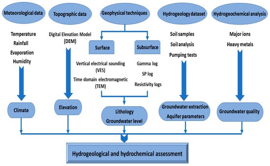 Figure 3 illustrates the integration of the techniques utilized to achieve the study’s goal. First, we determined the topography and climatic factors of the research location. Following the start of the field work, the most appropriate geophysical methods were used to explore the groundwater, identify the subsurface layers, and determine the depth of the water level. In addition to obtaining the hydrogeological information of drilling wells, well pumping tests and sediment analyses were also used to ascertain the properties of the various layers of the reservoir. Finally, by analyzing of major ions and heavy metals in the groundwater samples, we could evaluate of the reservoir’s quality.