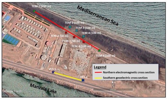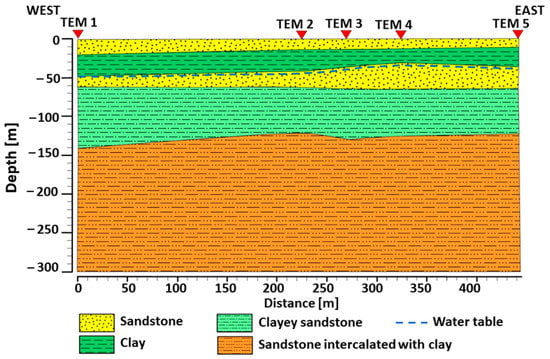 In this investigation, 2 VES soundings were performed utilizing a one-dimensional Schlumberger array with a maximum current electrode spacing (AB) of 600 m to penetrate reasonably deep, particularly near the exploration wells in the southern portion of the study region. The field measurements started at two meters between the current’s poles and increased up to 600 m to learn about the underlying sequences and recognize the various aquifer layers. The SAS-300 system was employed, which records changes in ground resistance values quite accurately. The AIE-2 TEDM system conducted a total of eight transient electromagnetic (TEM) soundings. These eight soundings were performed in the research area’s northern region, where it was practical to conduct them. Single loops of 50 × 50 m and 100 × 100 m were carried out at TEM sites 2, 3, and 4, whereas the single loops of 150 × 150 m were carried out at TEM sites 1 and 5. Finally, the 1X1D program was used to integrate VES and TEM results with the underlying soil model created from the very nearby drilled well in order to determine the true resistivity values for the various geoelectric layers and generate electromagnetic and geoelectric cross sections (Figure 4).