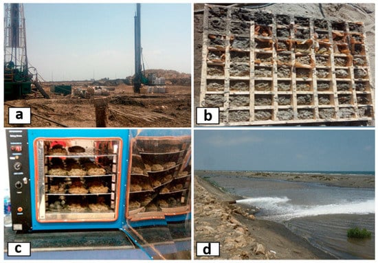 (a) Drilling of wells in the study area, (b) sediment samples during drilling of wells, (c) drying the sediment sample in the oven, and (d) during the pumping test of well.