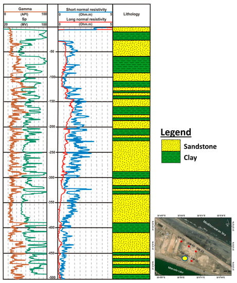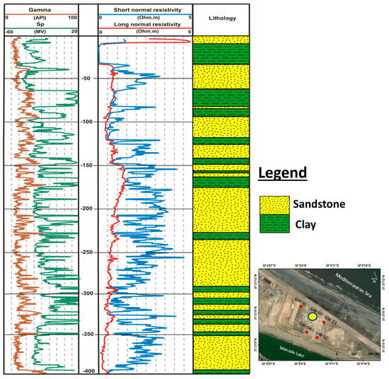 Numerous geophysical methods are employed for subsurface hydrogeological applications; however, geophysical well logging is a useful tool for assessing the underlying lithologic and hydrologic conditions [,,,]. This type of survey provides in-situ information regarding the physical characteristics of the underlying strata (such as resistivity, radioactivity, and permeability) and groundwater quality []. Three geophysical well loggings were carried out within the study area for three wells (GW02, GW04 and GW05) at depths of 400 m, 500 m, and 70 m, respectively (Figure 5a). In each well, a gamma ray log, self-potential (SP) log, and short normal resistivity and long normal resistivity logs were performed.