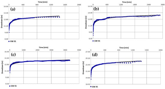 Continuous pumping test curves of unconfined aquifer (aquifer A): GW 01 for 24 h (a), 48 h (b), and 72 h (c), and GW 05 for 24 h (d).