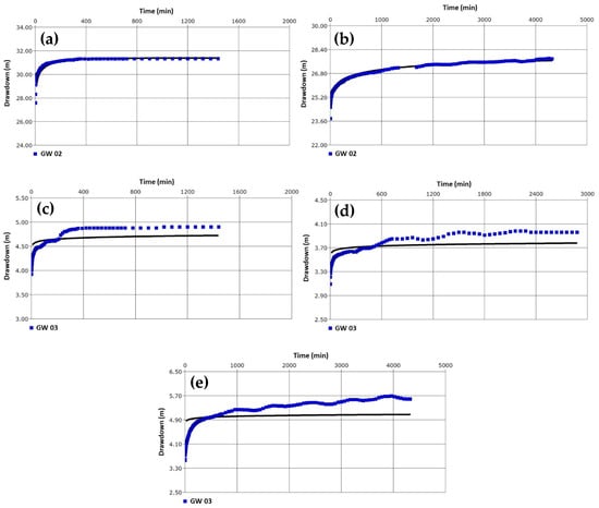 Continuous pumping test curves of leaky aquifer (aquifer B): GW 02 for 24 h (a) and 72 h (b), and GW 03 for 24 h (c), 48 h (d), and 72 h (e).