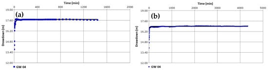 Continuous pumping test curves of deep confined aquifer (aquifer C): GW 04 for 24 h (a) and 72 h (b).