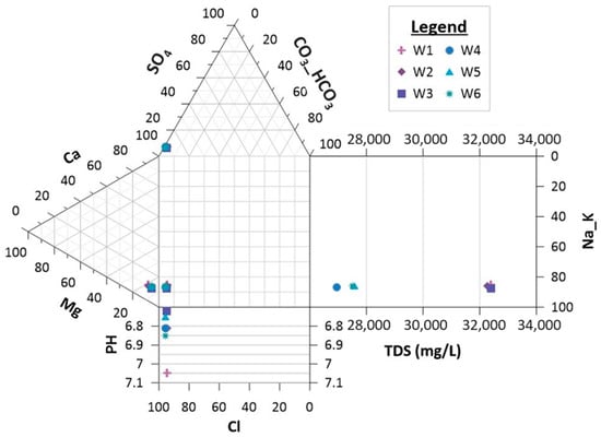 Table 2 shows the hydrogeochemical parameters of the groundwater samples that were analyzed to describe the chemical characteristics of the groundwater in the three layers and the permissible limits for drinking water purposes according to the World Health Organization (WHO, Geneva, Switzerland) standard [].