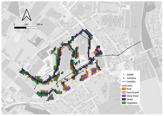The sewer system in the area follows a separate scheme; hence, two different types of sewer subnetworks are present. On the one hand, a sanitary system collects the wastewater generated by the different buildings in the area and transports it to a collector in the north of the area, which further transports it to the wastewater treatment plant. Furthermore, runoff produced in the area is collected by a stormwater system and discharged into a nearby river, called Lockwitzbach. In the present study, only the stormwater system was considered in all analyses. Figure 1 illustrates the different characteristics of the study area and its drainage network.
