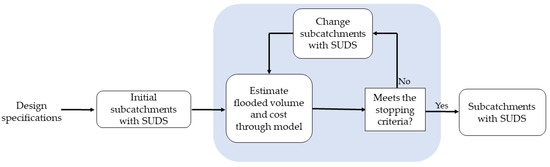 The general framework proposed for the procedure is presented in Figure 2. Regarding the design specifications, the objective functions were defined as total flooded volume and cost of SUDS. At the same time, the independent or decision variables were set as the subcatchments from the EPA SWMM model, which would have the presence of SUDS. The constraints for assigning SUDS were defined depending on the land uses. Hence, typologies were assigned following the description made in Table 5. It is worth clarifying that the presence of SUDS in each subcatchment was defined as total or null, which means that, if a subcatchment was selected, it was assumed that it was completely covered by the corresponding SUDS.