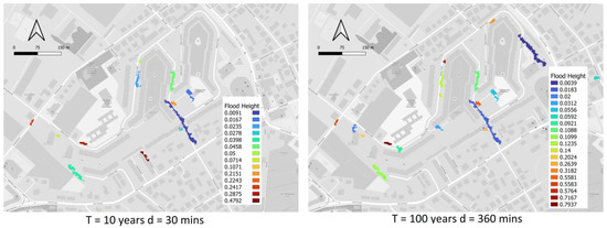 Figure 3 presents the flood maps obtained for the two extreme rain events (lowest and highest rainfall depth). The analysis of these events, which coincided with the dynamics identified for the rest of them, showed that the most susceptible areas to be flooded were the same in all cases. Regarding flood heights, they ranged between 0.009 m and 0.47 m for the smallest event. As the design event was larger, the maximum flood depths increased, and also new flooded areas gradually appeared. The event with the highest flood depths reached values of up to 0.8 m, and presented new flooded areas with higher water levels.