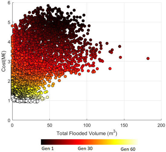 The optimization–selection process was performed 12 times, one for each rainfall design event. Overall, each process took from 6000 to 30,000 iterations, depending on the rain event, which took between 6 and 9 h of computational processing time. Furthermore, the number of generations needed for the GA algorithm to reach the stopping criteria ranged from 20 to 60. To illustrate the performance of the GA algorithm and the improvements reached at each generation, Figure 4 shows the 11,600 iterations that were necessary to reach the Pareto front for the event with T = 10 years and d = 30 min.