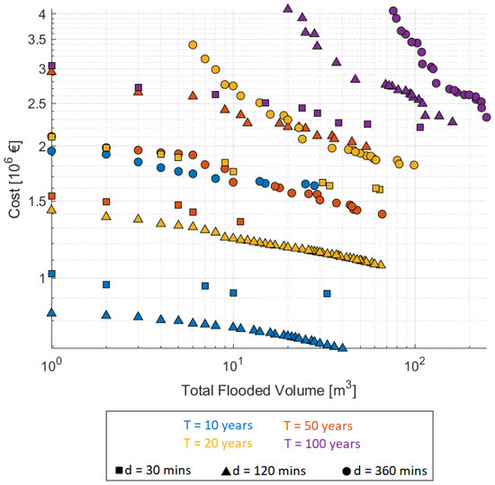 The twelve Pareto fronts were highly variable, depending on the rainfall events (see Figure 5). Overall, it was identified that the larger the event was, the greater the range of variation of costs and flooded volume. From the twelve events, nine offered solutions in which flooding was reduced completely.