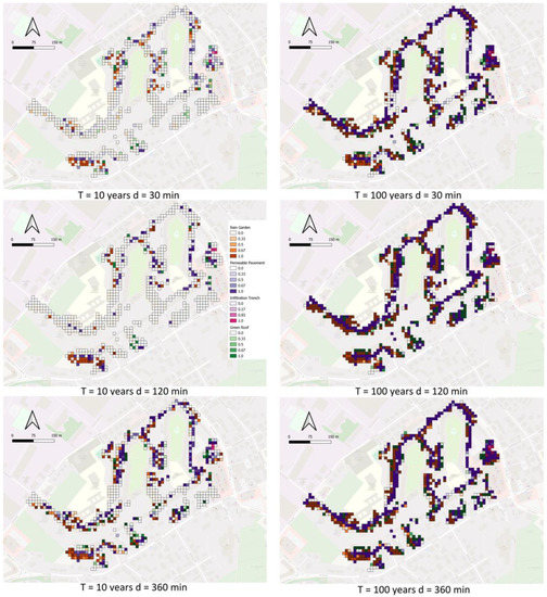 Regarding the spatial distribution of SUDS, in the events with T = 100 years, almost all subcatchments were selected, and their selection frequencies were high (in many cases 1). It was also possible to identify some differences between the three events, with progressive but slight increases in the implementation of SUDS, as the duration of the event increased. On the other hand, for the 10-year return period, it was identified that the differences between the three events were sharper. In all cases, the distribution of SUDS started from focused and specific locations, and as the duration of the event increased, these zones were expanded. These areas coincided with the susceptible areas of flooding from Figure 3, leading to the conclusion that this is an important aspect to consider when placing and designing SUDS.