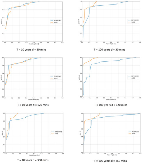 Figure 7 illustrates the effect of SUDS on the flood depths as a function of the return period and the duration of the rain events. The empirical cumulative distributions of flood depths for the reference (i.e., without SUDS implementation) and SUDS scenarios are compared. Only the results for the 10- and 100-year return period scenarios are shown. Regarding the reference conditions, outcomes of this analysis indicate that for all rainfall scenarios, between 85% and 90% of the flooded areas had an associated depth equal to or lower than 0.2 m. Furthermore, maximum flooded depths ranged between 0.4 and 0.8 m, and increased with higher durations and higher return periods, as expected due to the increase in flooded volumes.
