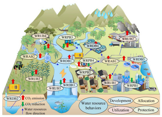 - The WRDBs and WRABs produced a total of 0.256 billion tons of CEE. Among the WRDBs, reservoir storage and surface water lifting have the most CO2 emission effect. Among the WRABs, the CEE from inter-regional water transfer is smaller than that from tap water allocation. Water resource protection behaviors produced −87 million tons of CEE. The absorption effect of wastewater treatment behavior is the main contributor to CEE, followed by reclaimed water reuse behavior and water saving behavior.