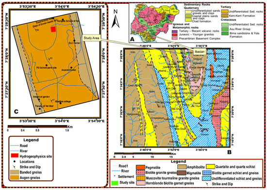 - Adelana, S.M.A.; Olasehinde, P.I.; Balle, R.B.; Vrbka, P.; Edet, A.E.; Goni, I.B. An overview of the geology and hydrogeology of Nigeria. In Applied Groundwater Studies in Africa, Chapter: 11; Adelana, S.M.A., MacDonald, A.M., Eds.; Taylor & Francis: London, UK, 2008; pp. 171–197. [Google Scholar] [CrossRef]