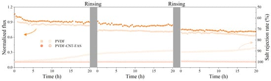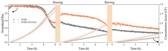 The variation of the normalized flux and concentration factor over time for the PVDF and PVDF-CNT-FAS membranes are illustrated in Figure 2 with continuous concentrations of real shale gas wastewater. In the first cycle, the flux of both membranes started to decrease quickly after 6 h, and the final variation was 60% and 40% for the virgin and modified membranes, respectively. Meanwhile, a slightly higher concentration factor for the PVDF membrane compared to the PVDF-CNT-FAS membrane may be related to the relatively higher initial flux (i.e., 23.6 kg/(m2∙h) for the former and 22.92 kg/(m2∙h) for the latter, respectively. After the first rinsing, the fluxes for the PVDF-CNT-FAS and PVDF membranes were restored to 80% and 60% of the initial values, respectively. The better flux recovery for the modified membrane was probably due to a smooth superhydrophobic interface, agreeing with its contact angle result. In such a case, the foulants would have less time and area to adhere to the membrane interface and thus are more likely to induce reversible fouling, which was washable via physical rinsing [,,,]. Nevertheless, during the following two-cycle experiments, the flux did not completely recover after physical rinsing, which could be attributed to the adhesion and accumulation of complex foulants on the membrane surface. It was reported that the coupling of the membrane electrochemical reactor and alkaline solution cleaning led to the almost complete removal of severe irreversible fouling []. The CNT-coated membrane developed in this study exhibited potential as a membrane electrode, and further study on chemical cleaning could be worthwhile. Furthermore, the flux and concentration factor of the modified membrane were both higher than the control, despite the gradual flux decrease. Figure S1 further compares the volume of desalinated water and the salt rejection data for the two membranes after each cycle. An acceptable salt retention ratio (>99%) found at the end of each cycle suggested a low wetting occurrence for both membranes.