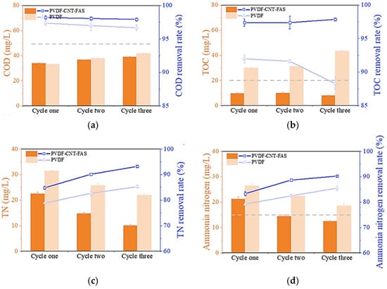 Figure 3 analyzes the quality of the permeate water collected at the end of each cycle in MD. Figure 3a shows that the COD value gradually increased with the cycle number of the experiment for both membranes, and their retention rates were above 95%. The final highest value was found to be less than 50 mg/L, which meets the local standard for wastewater discharge of GB8978-2006. The performance of the two membranes in terms of COD retention was not distinct. Then, as shown in Figure 3b, the TOC content in the permeate (ca. 35 mg/L) was found to exceed the standard value (20 mg/L), and the final removal rate was decreased to less than 90% for the PVDF membrane, which was clearly inferior to the performance of the PVDF-CNT-FAS membrane (the TOC content was ca. 10 mg/L and the removal rate was over 97%). The TOC is considered a more straightforward representation of the organic matter than the COD in water monitoring because several reductive substances, whether organic or inorganic, could induce high COD values [,]. Thus, the TOC data in Figure 3b, regarded as a better indicator in this work, suggested that modified membranes could retain the mass transfer of organic substances well since the salt rejection rates of both membranes were nearly satisfactory. Indeed, previous reports have shown that small amounts of benzene, PAHs, and humic organic matter were found in shale gas wastewater, which could result in membrane wetting and fouling [,,]. Considering only a slight leakage of organic compounds (rejection > 90%), we assumed that only some volatile organic compounds were probably transported across these hydrophobic membranes.