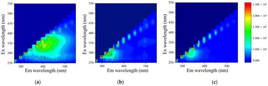 Three-dimensional fluorescence analysis for the (a) real shale gas wastewater and permeates from the (b) PVDF membrane and (c) PVDF-CNT-FAS membrane.