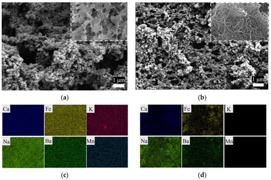 SEM-EDS images of the (a,c) PVDF and (b,d) PVDF-CNT-FAS membranes. The top-inserted image refers to the virgin membrane.