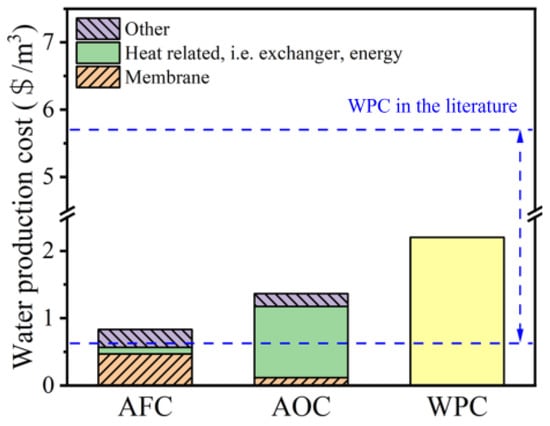 The annual fixed cost (AFC), annual operating cost (AOC), and total water production cost (WPC, sum of the AFC and AOC) estimated for the shale gas wastewater treatment using the PVDF-CNT-FAS membrane in this study, including a section for the membrane, heat exchange or thermal energy, and other expenses. The cost analysis for the PVDF membrane is not provided considering its deteriorated permeate quality compared with the local standard.